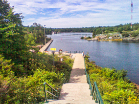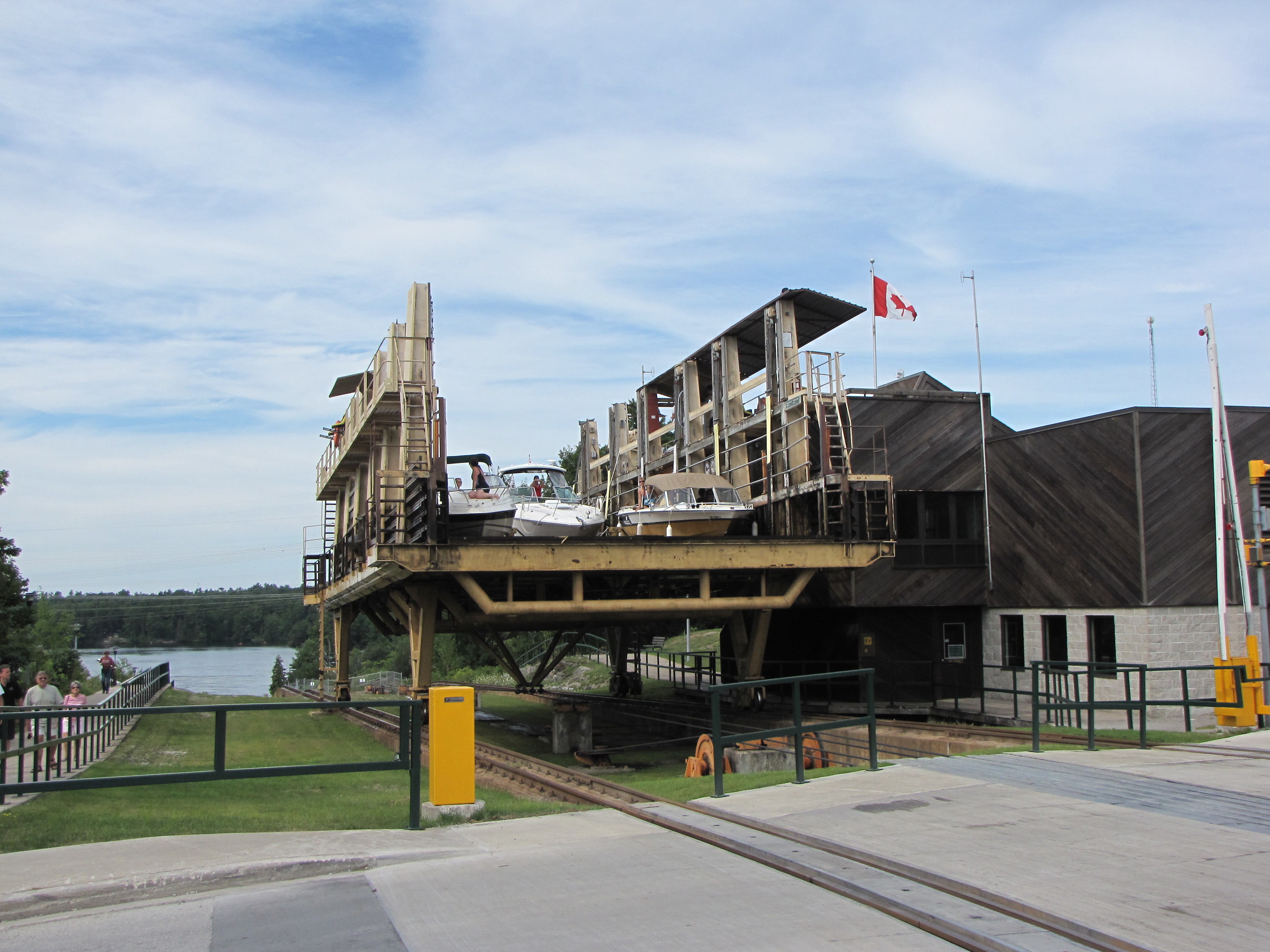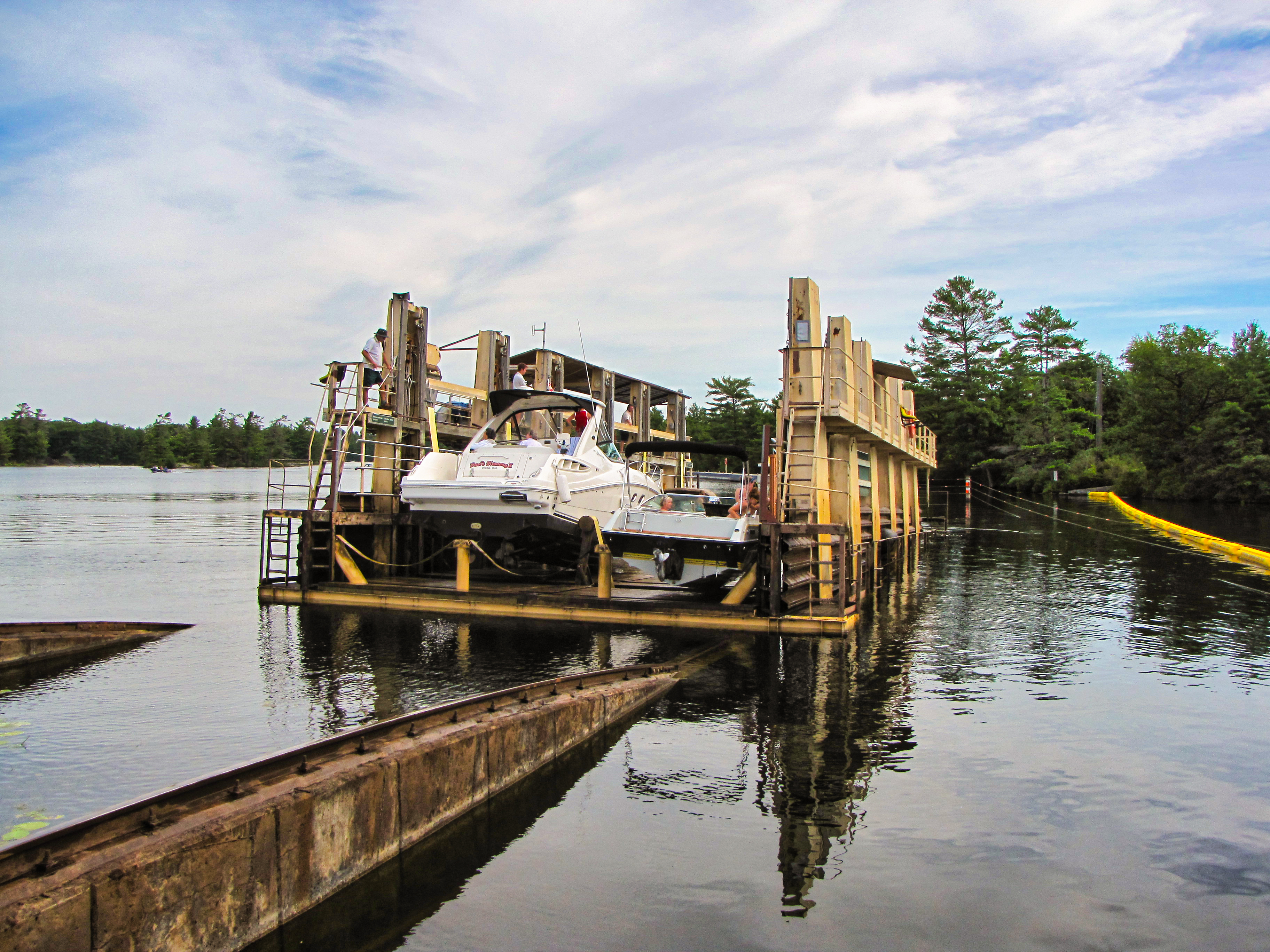 ▶ These pictures are made on much smaller level of waterway transportation, used by owners of smaller boats to pass from one lake to other one during their vacation trips. The entire system used to accomplish such transfers is called locks.