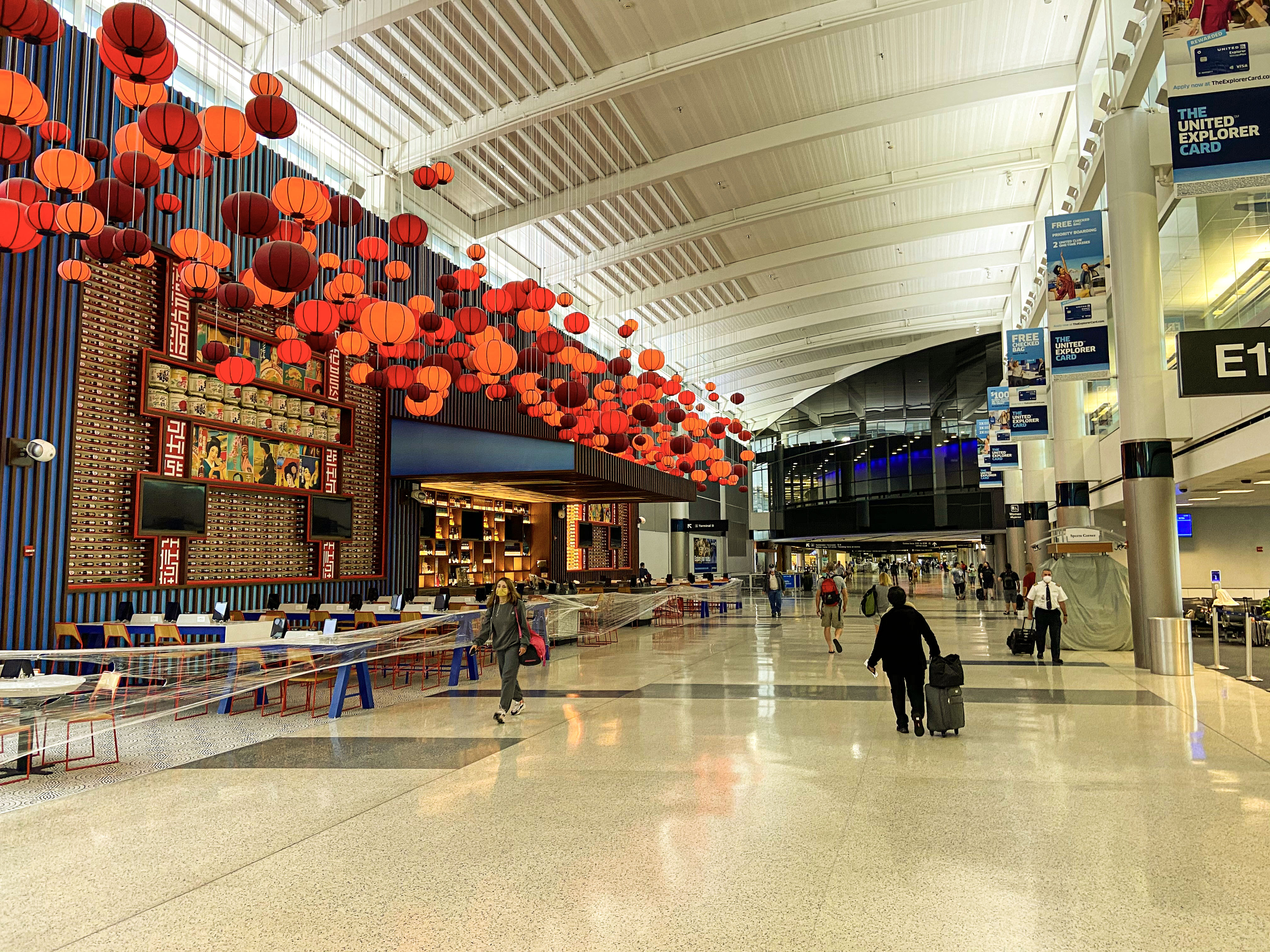 Some travelers were very creative when choosing their masks. Moving around the airport corners we suddenly ran into a few travelers wearing cowboy bandanas, which reminded us to Hollywood stages with actors when filming movies. Instead of Hollywood filming Stage 11 it was actually the gate 11 at Houston airport terminal.